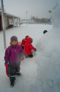 When we woke up this morning erverything outside was white of snow. The snow kept falling down, white and beautyful. The kids love to play outside in such a wheater and this morning everybody was happy building snowman and playing together.
